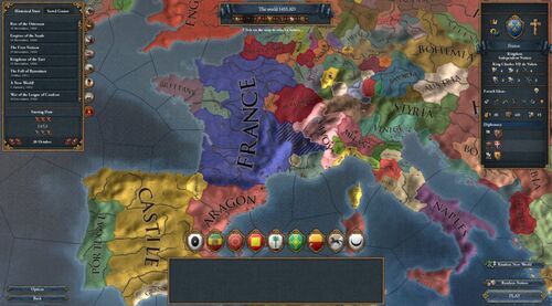 初アイアンモードをプレイする。 使用国家はフランス。ただし1453年10月20日スタートとする。 百年戦争終結の翌日である。 君主はシャルル7世、50歳。高い能力値と、陸軍士気+5%の「指導者への鼓舞(Inspiring Leader)」などの性格を持つ。ただ、「異常なまで…