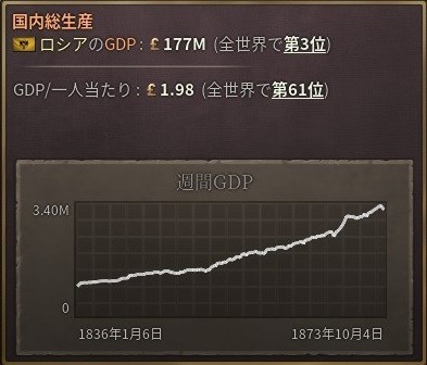 1873年10月6日時点で、ロシア帝国のGDPは1億7,700万ポンド。1856年の約2倍にまで成長しており、世界ランキングでは4位の大英帝国に3,000万ポンド近い差をつけて第3位の位置につけている。1人当りGDPもかなり改善してきた。
