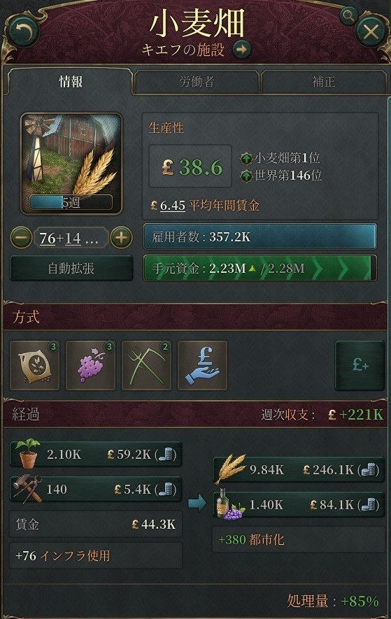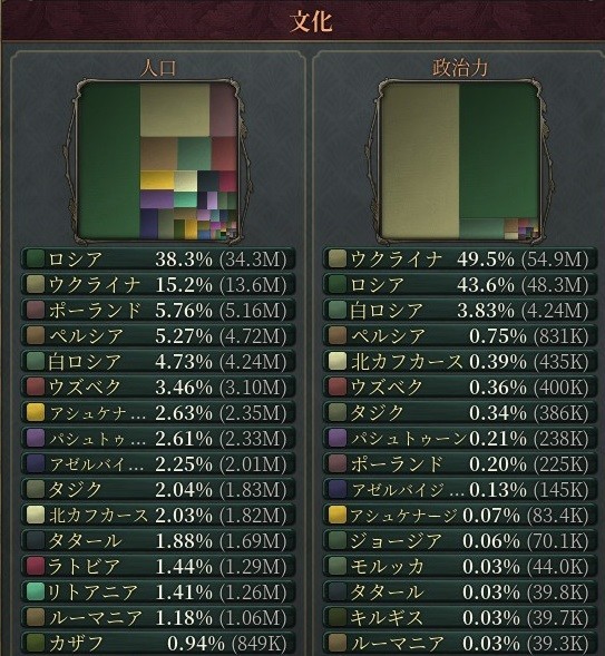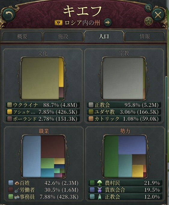 首都ルハンシクとキエフにはひたすら小麦畑を造営し、その経営者たちを豊かにするための政策を続けたほか、新たに獲得したペルシアやステップ地帯ではロシア本国では作ることのできないアヘンを大量栽培。