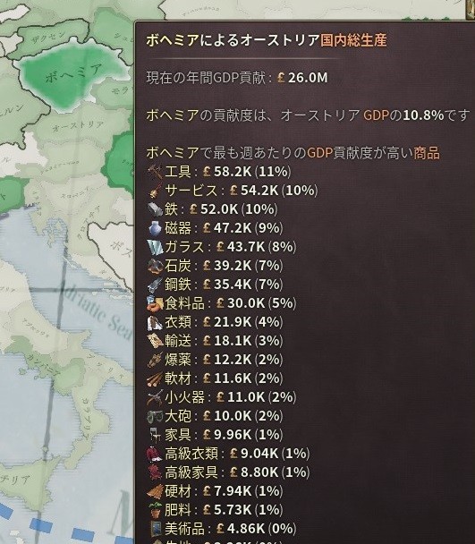 スラウェシ島で採れるコーヒーやカフカース地方でも採れるタバコは意外と収益が取れておらず(タバコはアメリカが相手のため輸送費が嵩む)、とにかく小麦とアヘンとワイン、茶葉、そして染料が重要な輸出品となっている。