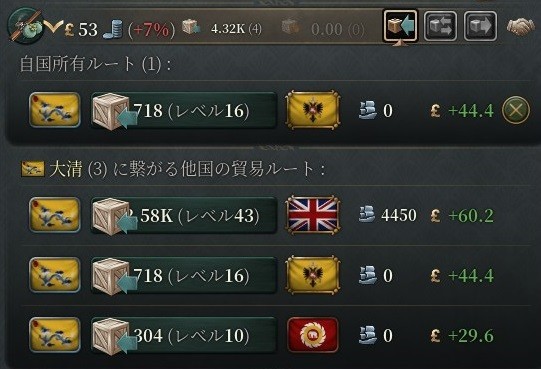 現在、ロシアは清に対し、2つの交易ルートで合計1,436ユニット/週のアヘンを輸出しているが、イギリスが清に対して売りつけているアヘン量は2,580ユニット/週に及ぶのである。