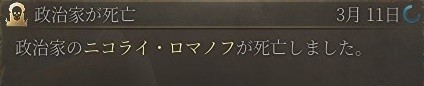 享年77歳。史実より20年近くも長生きした末でのその最期は、居室にザヴォイコ氏のみを残しそれ以外の者をすべて退室させるなど、完全に彼に依存した哀れな老帝となってしまっていた。