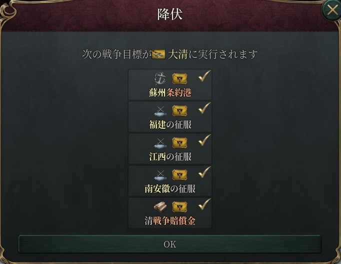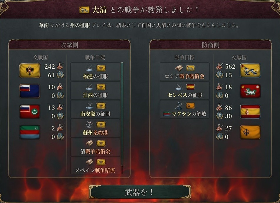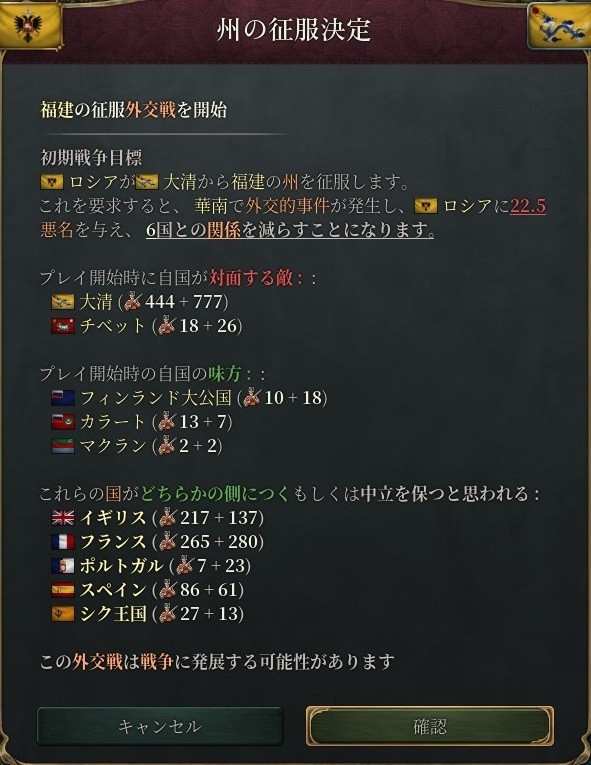 バルト司令部に駐在していたフリードリヒ・フォン・ベルク少将による上陸作戦も見事成功し、狙い通り蘇州・南安徽の領土も制圧。これで清の戦争支持率を0%以下に下げることが可能となる。イスカンダル作戦、見事成功である!