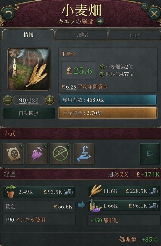 とはいえ、それで小麦畑がダメになったかというとそうでもなく、ワインや果物などの副産物が高値を維持していることもあり、「農業の奨励」布告と合わせ十分な利益を出せている。