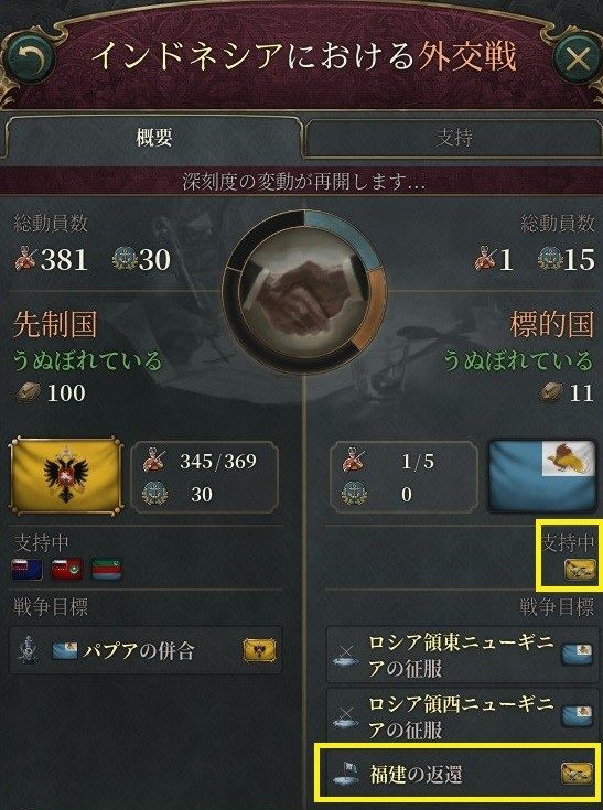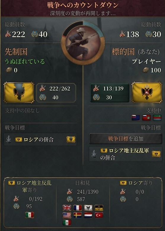 一方、世界は当然そんなロシアに対して厳しい視線を向ける。アメリカやイタリアはロシアへの禁輸を宣言し、ロシアとの貿易に依存しそこまでの手段に出るつもりはないプロイセンやオーストリア、フランスは非難だけを投げかけてきた。
