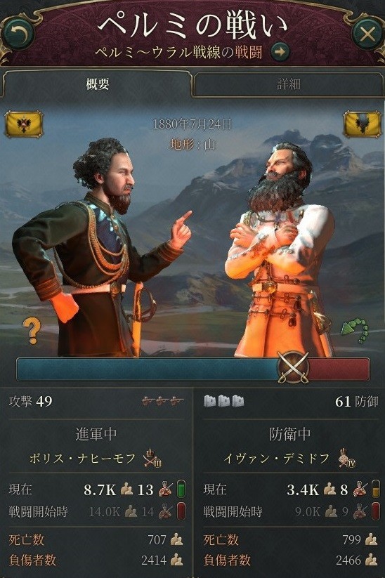 一方、東方戦線ではウラル山脈を最重防衛ラインとした皇太子軍のイヴァン・デミドフ大将が、皇帝軍のボリス・ナヒーモフ中将率いる攻勢軍によって押し込まれている。