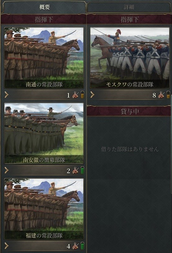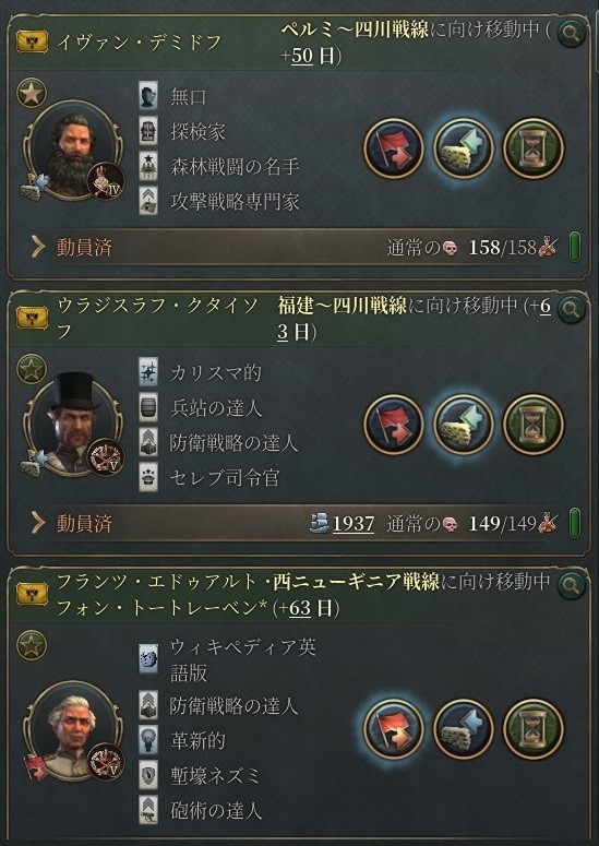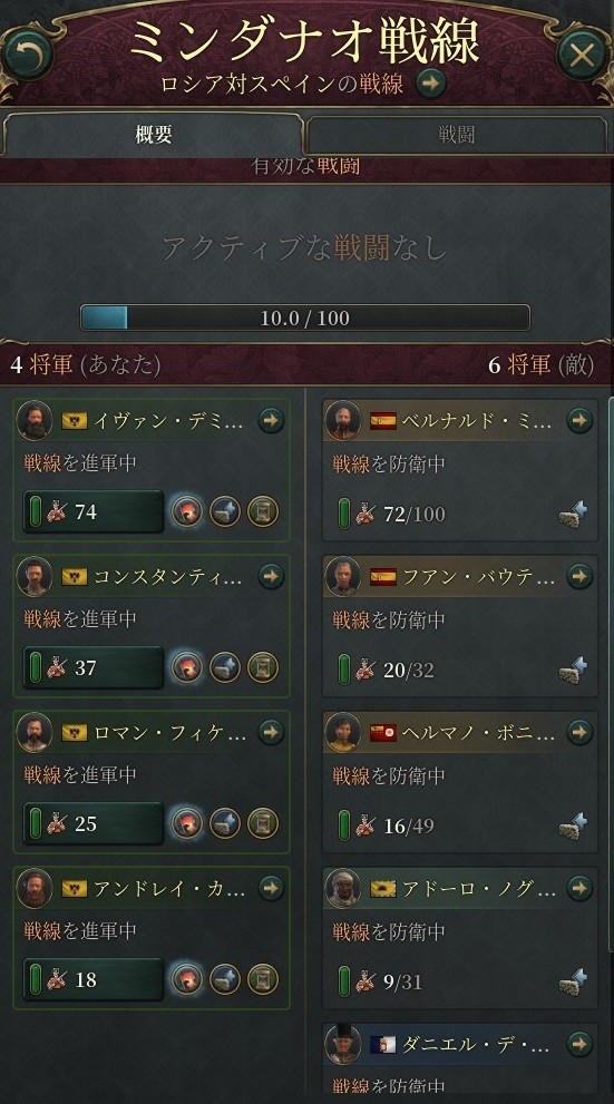 デミトフ大将やイグナチェフ少将(前回の戦争から一段階昇進した)、カメンスキー准将など、30代の若い指揮官にのみ任せ、最低限の動員でフィリピン戦線に向かわせる。これら若い指揮官たちは、「攻撃戦略の達人」や「砲術の達人」など、攻撃に特化した特性を持つ者たちが多く、今回のように優勢な戦争においては頼もしい存在となる。