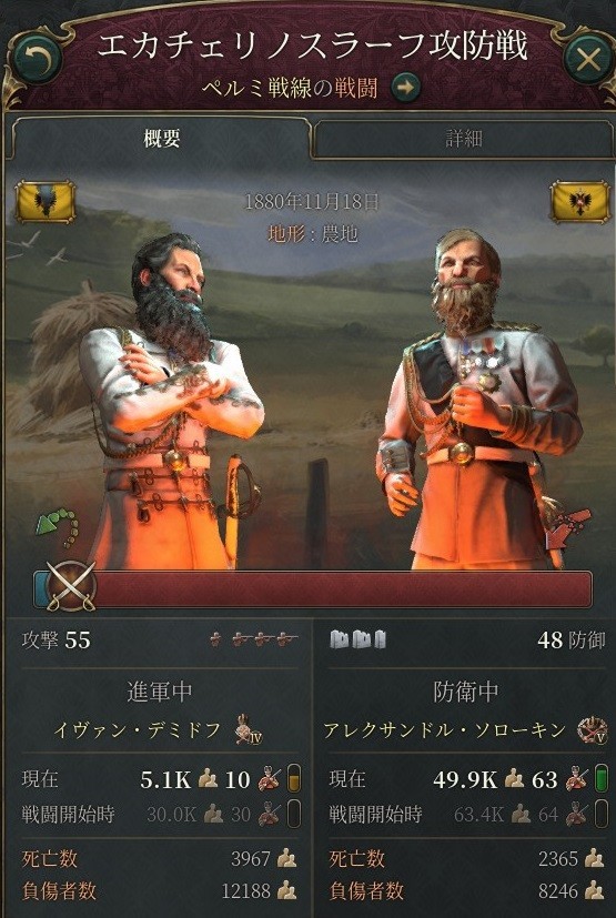 しかしこれはこの地に陣を構えていた皇太子軍の総司令官ウラジスラフ・クタイソフ元帥が決死の防衛を試みる。「防衛線の達人」であるクタイソフ元帥の鉄壁の守りに対し、「攻撃戦略の達人」であるスコベレフ少将も、湿地に足を取られてなかなかうまく連携が取れていないようだ。