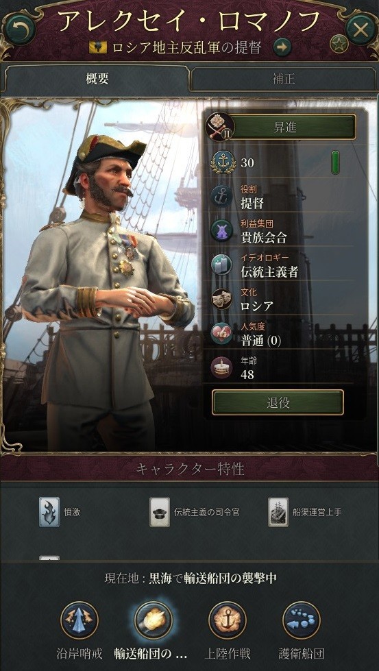 先のストレルカ戦争ではザヴォイコ提督と共に「イスカンダル作戦」を決行し、南通上陸を成功させて帝国の勝利に貢献した彼が、今回の内戦においても、黒海に運び込まれる帝国軍の輸送船を次々と沈没させていく。