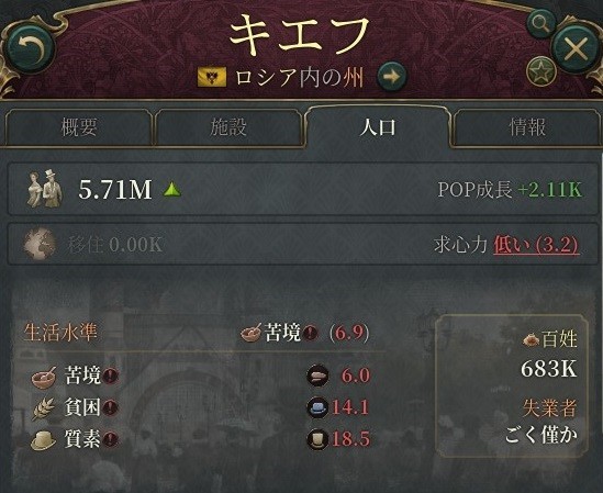 生活水準も低調。それでも税率最低・消費税なしにした結果、少しずつ上がってきてもいる。生活水準は低い人口が多ければ多いほど、穀物の消費量が増えるので上げる必要は全くないのだが。