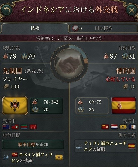 既に一度ストレルカ戦争で打ち負かしているスペインに、もはや先住民国家と変わらない程度の力しか持ち合わせていないオランダ如きを相手に、本気を出すまでもない。