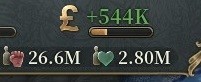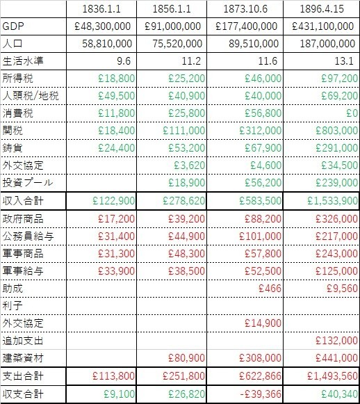 これで長らく国民を苦しめていた税率を最低規模にまで下げることができ、さらに消費税もすべてなくしてしまえる。それでもなお、20万ポンド/週の黒字が残るほどであった(なお、軍事賃金も最大にしてある)。