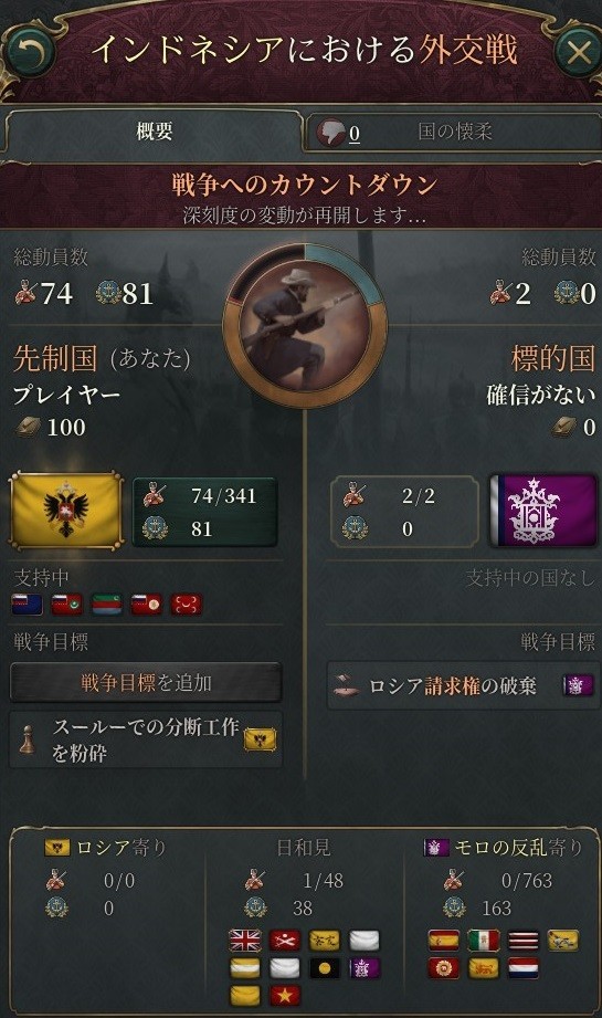 彼らと防衛協定を結んでいたオランダとオランダ領東インドが敵として回るものの、その総兵力は3万程度に過ぎず、ロシアの敵ではない。