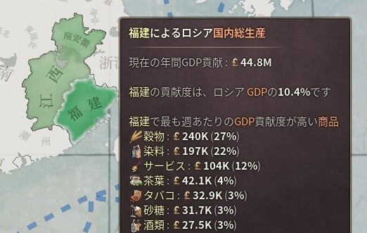 1896年時点でロシア人口の4割を超える7,700万の人口を抱えるこの中国植民地は、4州だけで帝国全体の3割弱のGDP貢献率を誇っている。まさに帝国の心臓部である。