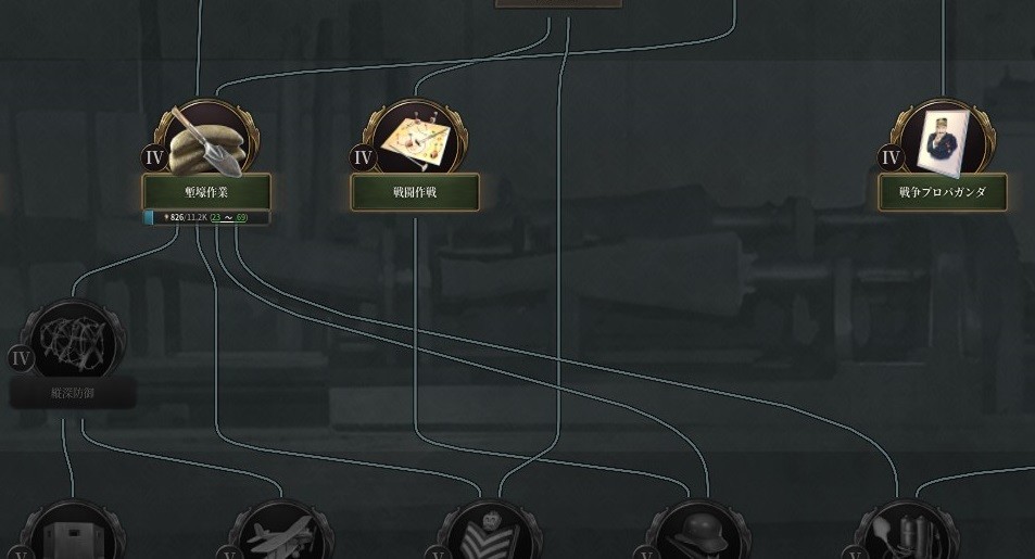 塹壕歩兵を解禁する「塹壕作業」を最優先でアンロックしつつ、攻城砲を解禁しつつ「士気の減少-5.0%」というパッシブ効果も解禁する「戦闘作戦」、同じく「士気の減少-5.0%」に加えて「徴兵可能な大隊+20%」のパッシブ効果も解禁する「戦争プロパガンダ」、さらには「陸軍防御+30%」「士気の減少-5.0%」の2つのパッシブ効果を解禁する滅茶苦茶強い「縦深防御」くらいまでは狙っていきたい。