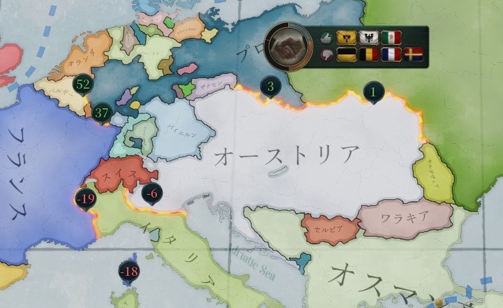すなわち、オーストリアを包囲するための仲間探し。お誂え向きに隣国の列強5位プロイセンと列強3位イタリアがオーストリアに敵対しているため、この2国に資金援助を行い義務を獲得しにかかる。それぞれ毎週10万ポンドくらい支出されるが、国庫歳入が毎週113万ポンドくらいあるロシアにとっては特に問題はない。