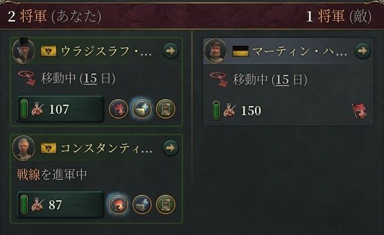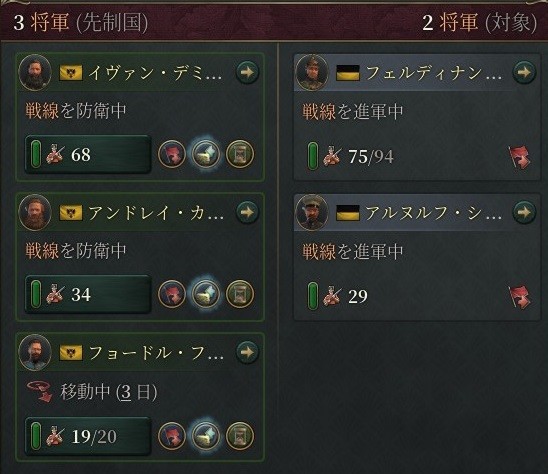 ここにはオーストリア軍10万が展開。こちらもロシア軍最強の猛将(「攻撃戦略の達人」持ち)であるイヴァン・デミドフ大将にアンドレイ・カメンスキー少将といった内戦時代からのベテラン、そして「防衛戦略の達人」「塹壕ネズミ」などをもつ防衛巧者フョードル・フォン・モーレンハイム准将による合計12万の軍勢を配備する。