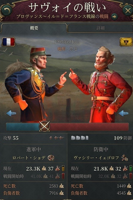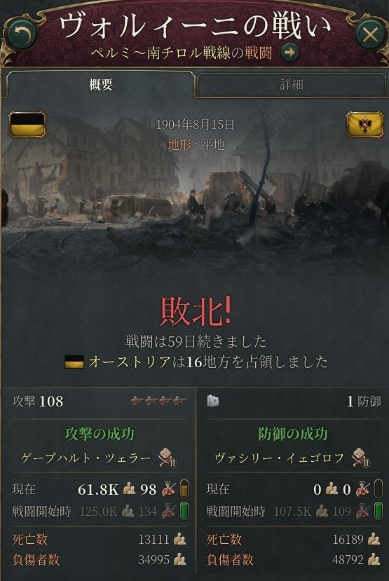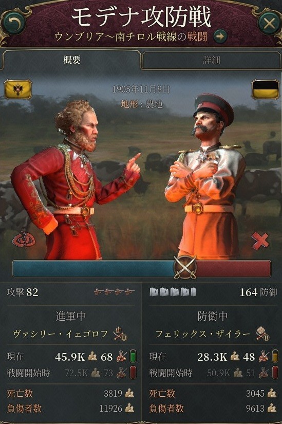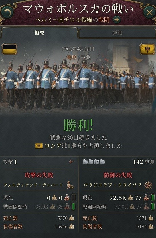 オーストリア軍のガーハルド・シュミットラー元帥率いる3万5千の部隊を、イグナチェフ大将は6万の軍でもって防備する。敵軍は物資不足によるペナルティのみならずなぜか設備適合によるペナルティ儲けており、しかも「視界不良」によるマイナス補正がついて攻撃力が落ち込んでいる。最終的なキルレシオは10倍近くに達した。