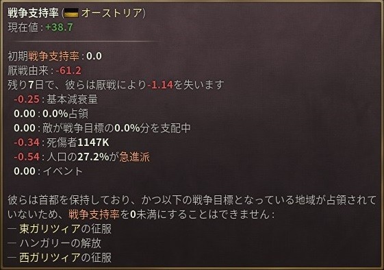 ハンガリー領への侵攻も始まったことで、いよいよ敵の戦争支持度も0%を下回り始めた。