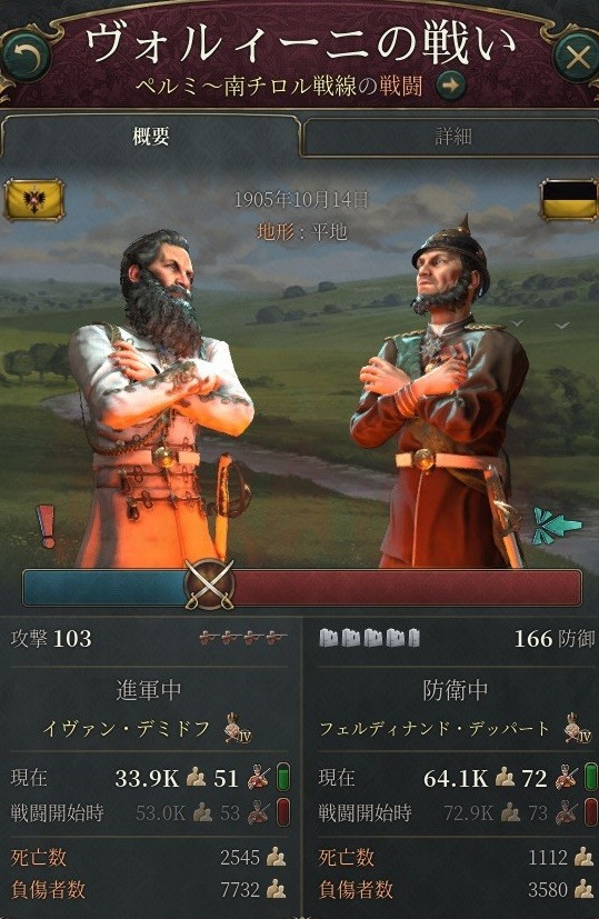 開戦から1ヵ月でロシア軍の戦死者数5,000人に対し、オーストリア軍の戦死者数は2万。戦争支持度の減りも、オーストリア軍の方が早い。優勢である。