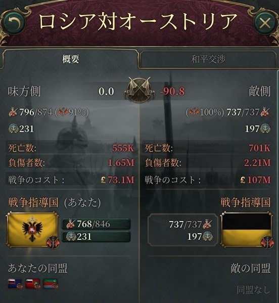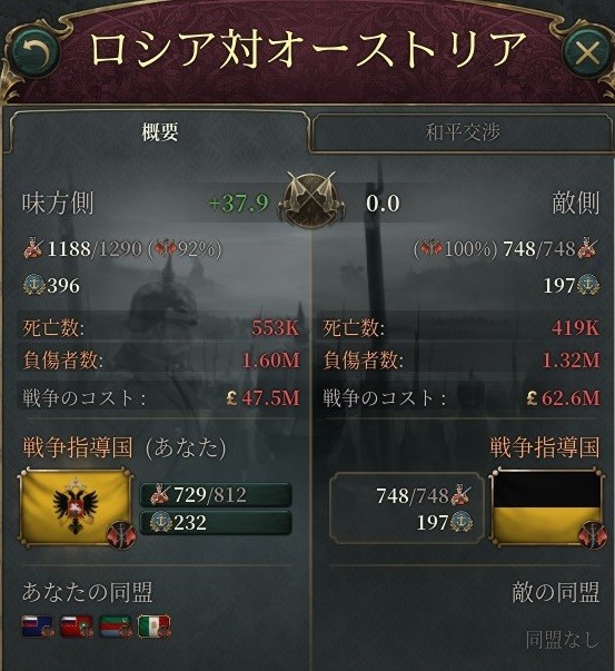 脇役は去り、戦いは列強上位4か国だけで繰り広げられることに。この時点でロシア率いる同盟国側は戦死者14万5千、オーストリア率いる連合国側は戦死者19万8千と、今のところは同盟国側優勢に推移していた。