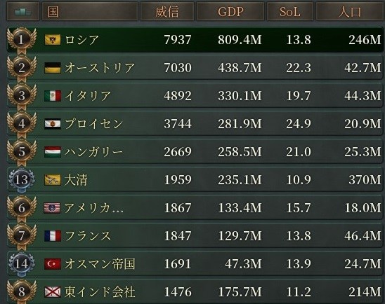まずは威信ランキング。最後の最後で復活してきたオーストリアに1位の座を奪われたと思っていたが、公務員の給与を普通に戻したらしっかりと追い抜いて1位に返り咲いた。GDPでは2倍近い差をつけ、圧倒的である。そして、独立させたハンガリーが列強5位にまで登り詰めている。