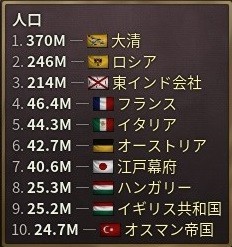 人口は最終的には東インド会社も抜いて2億4,600万人に。戦争による拡張はあったものの、移民を一切呼び込まない自然増のみでこの数字を達成した。現在、年242万人増えている。