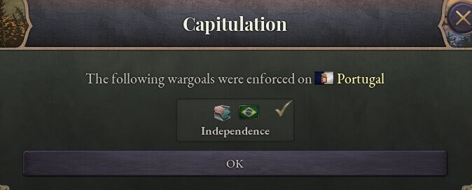 「また、我々がポルトガルの後ろ盾となっていた英国を封じ込めている間にブラジルがそのポルトガルに対する独立を宣言。対応しようと派遣されたポルトガル海軍をナタール沖の海戦で打倒し、独立が達成されたとのことだ」